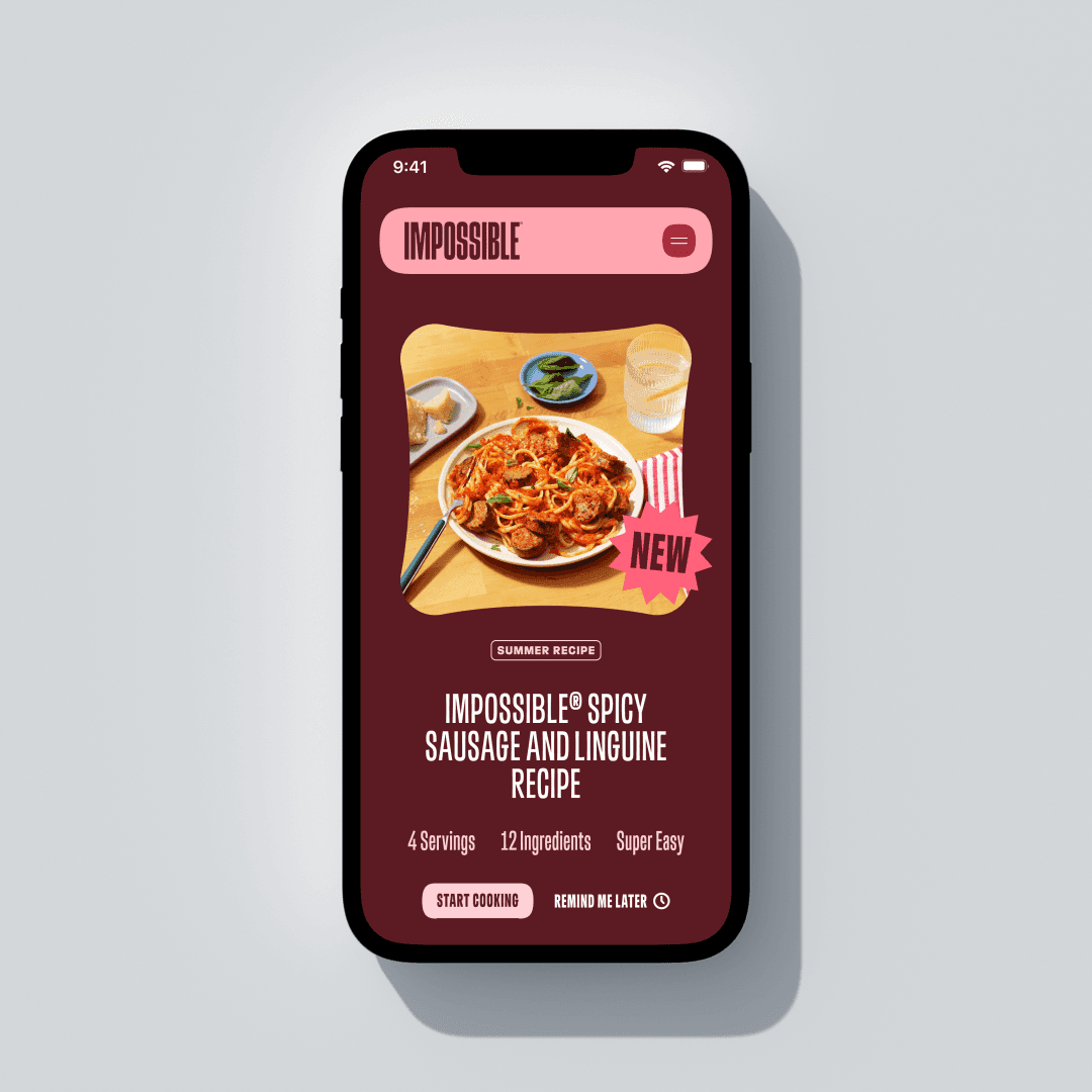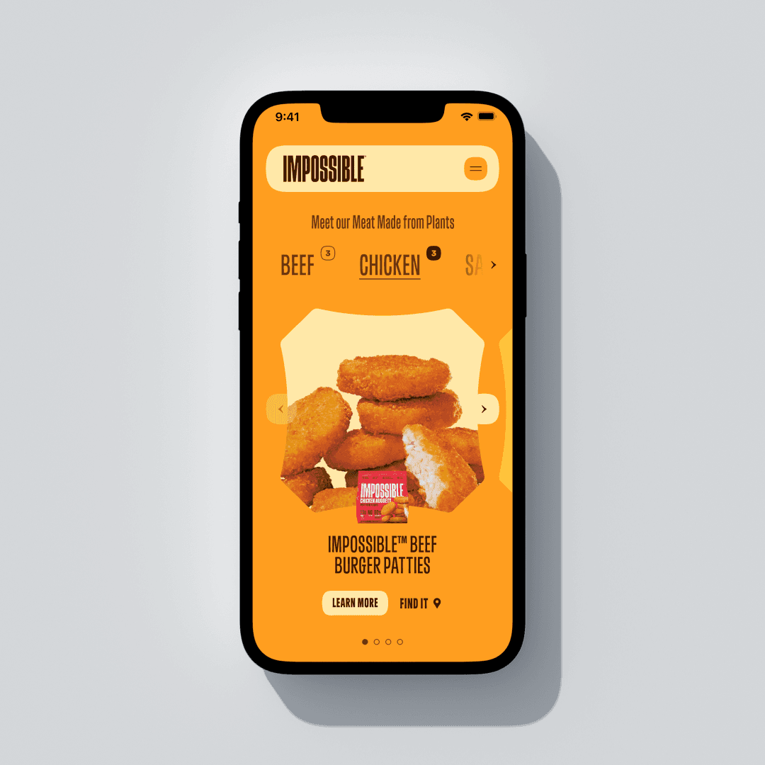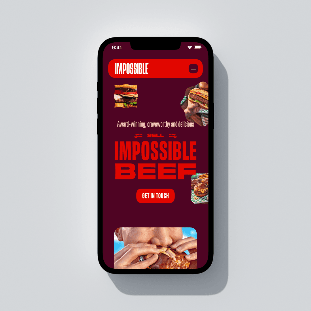 Impossible Foods’ new visual identity is loud, graphic and highly expressive. Strong typography, saturated colors and large food photography are used to communicate the richness of the products.